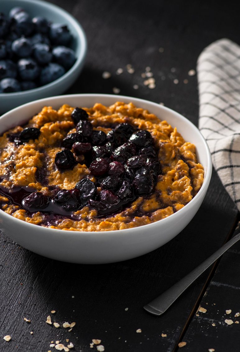 If you’re looking for cozy comfort in a bowl, look no further than Pumpkin Oatmeal with Blueberry Sauce. The pumpkin and cinnamon bring a creamy warmth to the dish, but the real secret ingredient is the boost of blue. Frozen blueberries sautéed with butter and maple syrup create a tasty, sweet-tart topping that will make your morning. It’s a healthy breakfast that feels more like an indulgent treat.